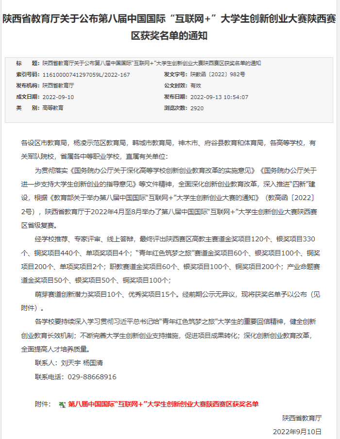 近日,陕西省教育厅公布了第八届中国国际“互联网+”大学生创新创业大赛陕西赛区获奖名单,咸阳职院在本次大赛中获金奖5项、银奖7项、铜奖3项,获奖率100%,获奖数量再创新高。