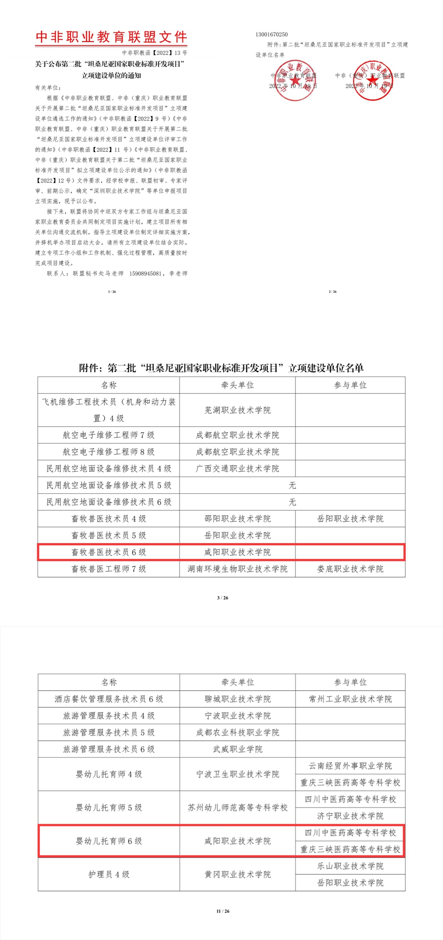 10月19日,中非职业教育联盟发布《关于公布第二批“坦桑尼亚国家职业标准开发项目”立项建设单位的通知》,咸阳职院成功获批第二批“坦桑尼亚国家职业标准开发项目”立项建设单位,并将以立项牵头单位开展后续的项目实施工作。