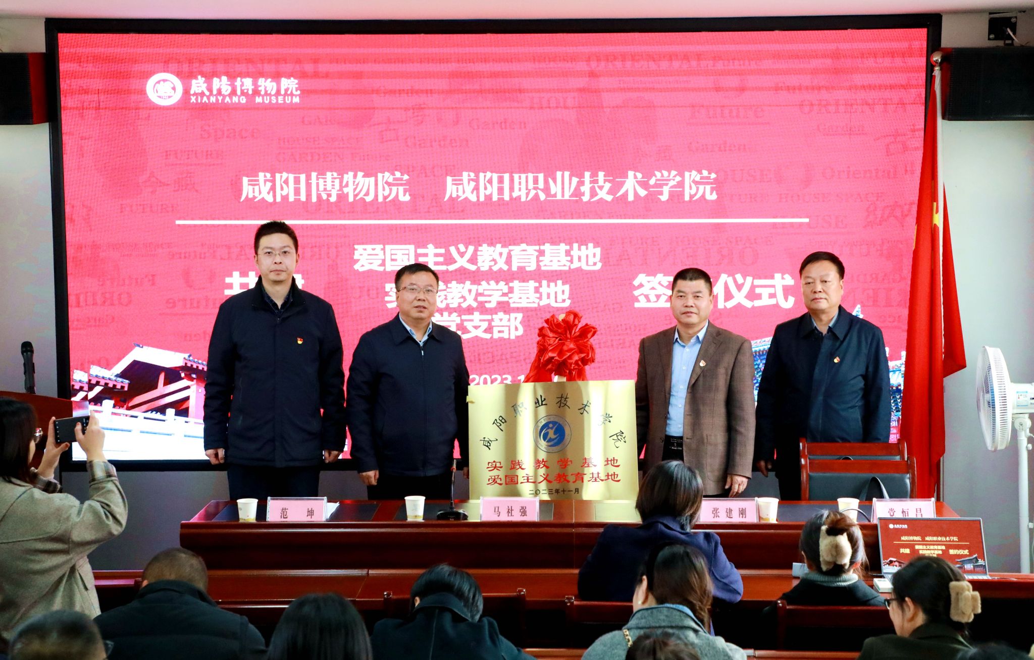 仪式上,学院党委副书记张建刚和咸阳博物院院长马社强分别致辞,并表示此次共建活动是咸阳职院和咸阳博物院在爱国主义和文化传承方面的积极探索,是打通高职学生成长成才道路,为旅游行业培养有温度、有深度、有热度的高素质技术技能人才,激发学生爱国热情和民族自豪感的生动实践。双方将以此次合作为契机深度开展形式多样、精彩纷呈的爱国主义教育和实践教学活动,共同为培养具有爱国情怀和文化自信的新时代高职人才贡献力量。随后,双方共同签订了合作共建协议并为爱国主义教育基地、实践教学基地揭牌。