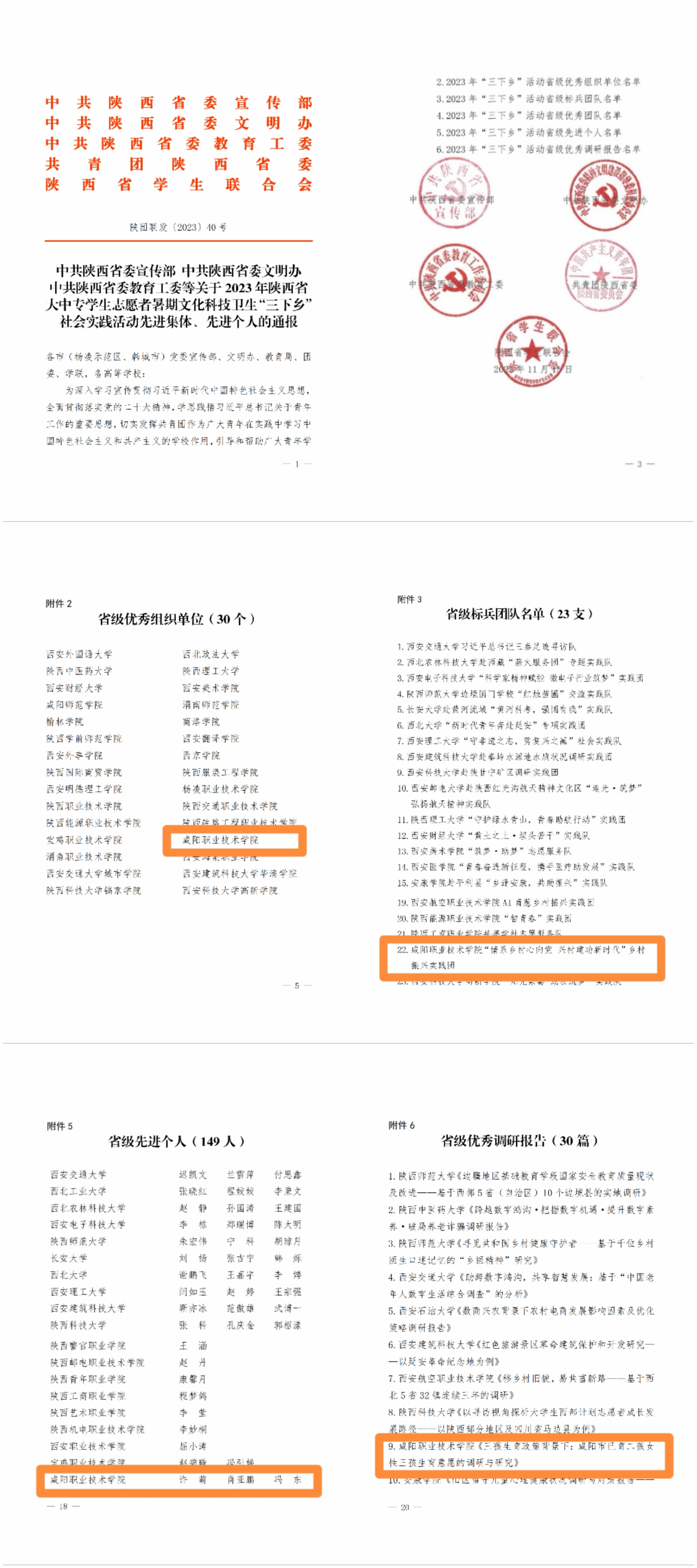近日,中共陕西省委宣传部、中共陕西省委教育工委、中共陕西省委文明办、共青团陕西省委、陕西省学生联合会联合印发《关于2023年陕西省大中专学生志愿者暑期文化科技卫生“三下乡”社会实践活动先进集体、先进个人、优秀调研报告的通报》,咸阳职院荣获7项荣誉。