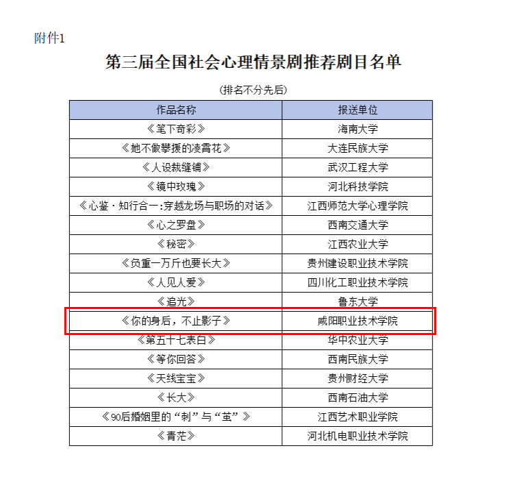 近日,国家心理健康和精神卫生防治中心和中国人口文化促进会联合发布了第三届全国社会心理情景剧推荐剧目名单。在来自全国的众多参赛作品中,我院选送的心理情景剧《你的身后 不止影子》脱颖而出,成功入选第三届全国社会心理情景剧60部推荐剧目,并成为陕西省高职类院校中唯一获得推荐的剧目,实现了该领域“零的突破”。