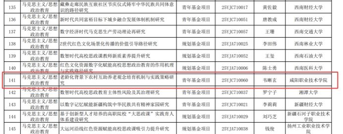近日,教育部社会科学司正式公布了2025年度教育部人文社会科学研究一般项目立项名单。咸阳职业技术学院韦晰玄主持申报的《老龄化背景下农村互助养老观念培育机制与实践策略研究》项目成功获批,实现了我院在该类别国家级科研项目上新的突破,标志着学院人文社会科学研究水平与核心竞争力取得重大进展。
