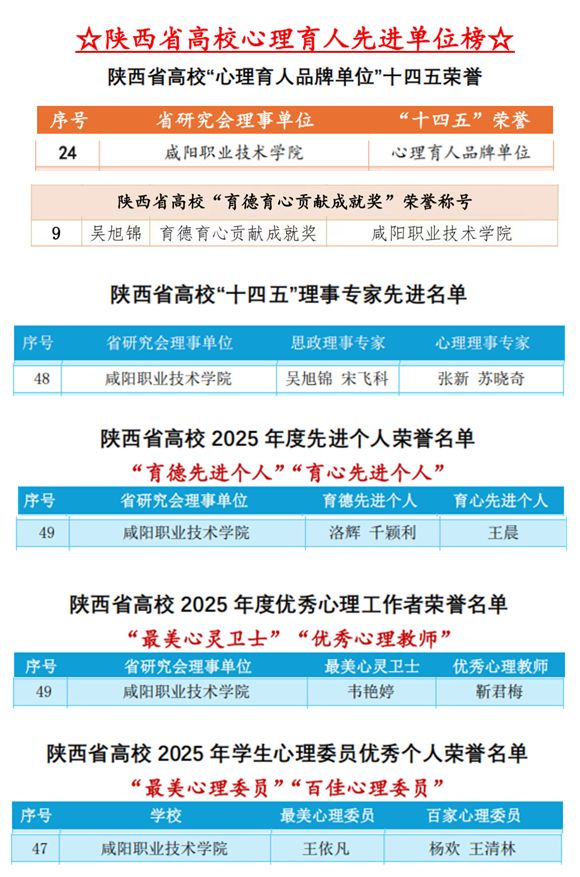 近日,陕西省高校心理素质教育研究会公布了“十四五”期间和2025年度心理健康教育工作先进单位和个人荣誉名单。咸阳职院凭借在心理健康教育领域的扎实工作与积极成效,获得多项表彰,集中体现了心理育人工作的整体水平。