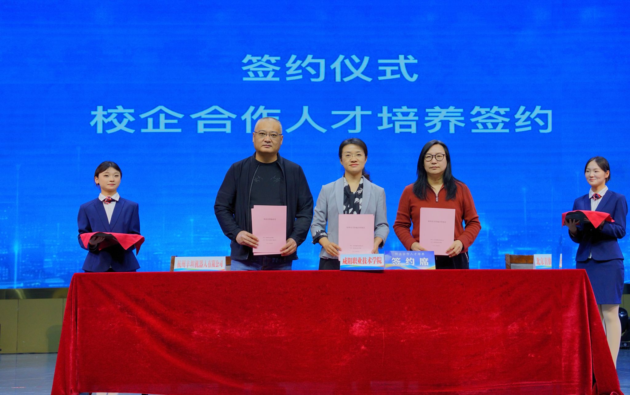随后,与会嘉宾共同见证“智能建造中国行·陕西站”活动盛大启幕。咸阳职院副院长冯华与杭州丰坦机器人有限公司、北京首旗科技有限公司进行校企合作签约,双方将充分发挥各自在人才培养、工程实践和智能建造技术产品研发等方面的优势,深化产学研合作,实现学生成才、企业发展、院校提质、产业增效的四方共赢。