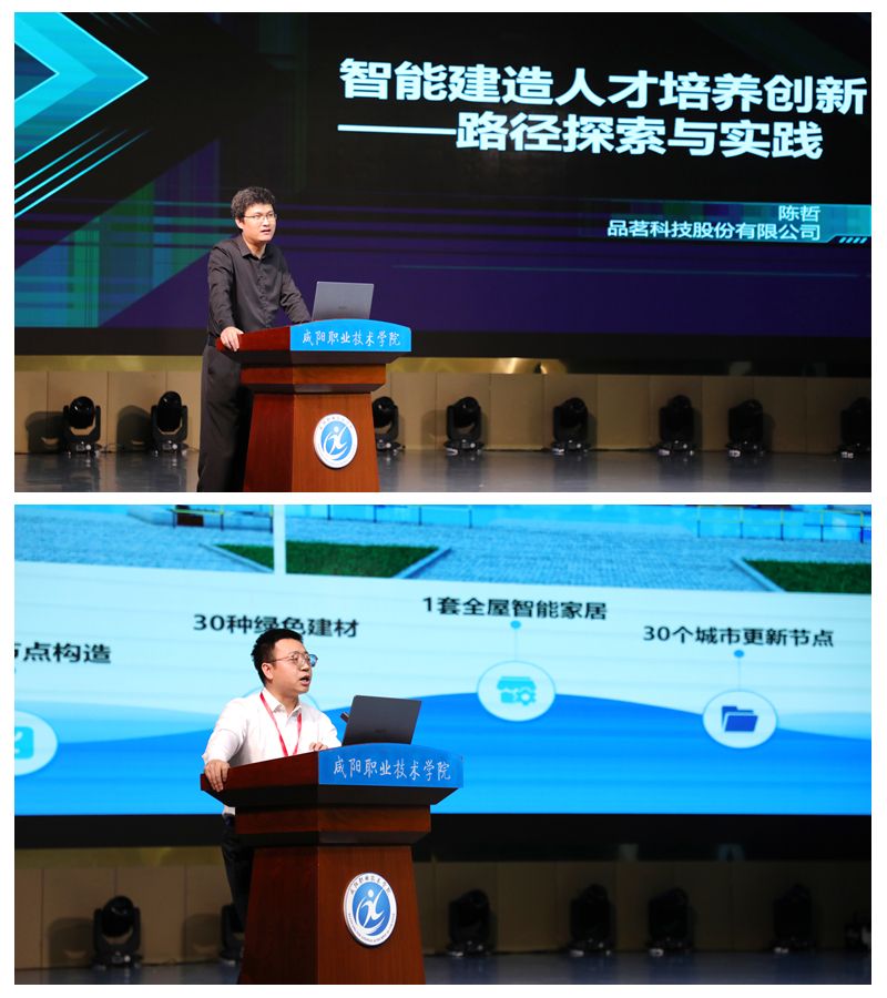 活动第三阶段技术分享环节,由西安航空职业技术学院副校长、省教指委轨道交通与智能建造产业教指委副主任委员邓志博主持。品茗科技股份有限公司教育技术总监陈哲、西安三好软件技术股份有限公司产品经理李彦军,两位企业专家分享了各自在智能建造领域的创新实践,教学实践与技术落地。