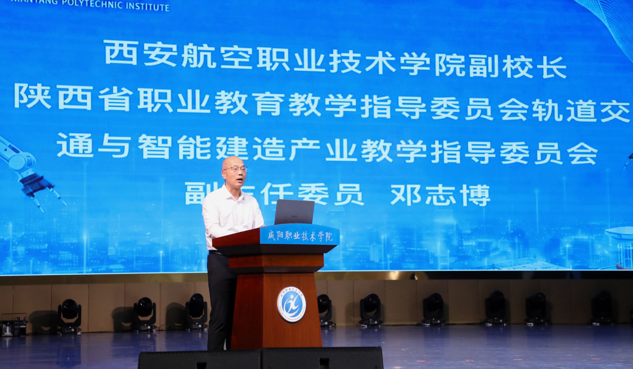咸阳职院院长杨卫军在致辞中向莅临现场的各位领导与嘉宾表示热烈欢迎。他指出,当前轨道交通与智能建造产业正加速向数字化、智能化、绿色化迭代升级,本次大会既是对“质量强国”与“中国建造2035”战略的积极响应,也是推动职业教育与产业需求精准对接的务实之举,愿与各界同仁共同探索智能建造人才培养新路径。陕西铁路工程职业技术学院党委书记、省教指委轨道交通与智能建造产业教指委主任委员焦胜军在致辞中强调,教指委要锚定政策方向、深化产教融合、紧盯技术前沿、凝聚各方合力,推动人才培养与产业需求精准对接。中国建设教育协会常务理事兼高职与成人教育专业委员会副主任委员赵研指出,“智能建造中国行”是2020年发起的行业公益活动,旨在传递智能建造前沿信息、搭建校企合作桥梁,本次活动首次与地方专业教学指导机构联合举办,为活动深化发展开启了全新模式。他希望以本次活动为契机,深化与陕西同行的合作,共同推动人才培养模式创新,为建筑业转型升级输送更多高素质技术技能人才。
