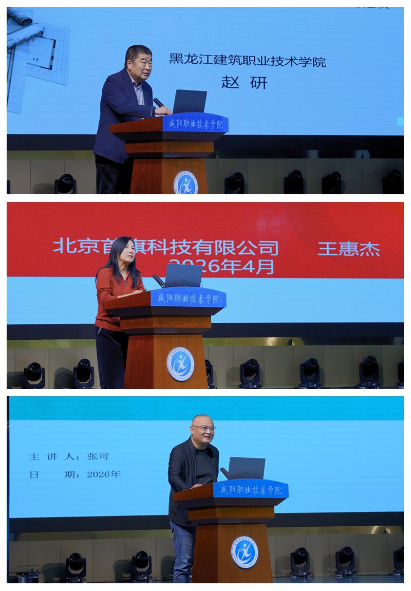 活动第二阶段主旨报告环节,三位专家就智能建造作主题报告,由中国铁路西安局集团有限公司职工培训部主任、省教指委轨道交通与智能建造产业教指委主任委员茹锡勇主持。赵研教授作题为《高职土建类专业创新发展的认识与建议》的报告。他结合全国高职土建类专业的发展现状,深入剖析了智能建造时代下专业建设的痛点与方向,引导院校主动对接产业需求,推动专业转型升级。北京市第五建筑工程集团有限公司副总工、北京首旗科技有限公司总经理王惠杰,以《企业智能建造转型探索及实践》为题,分享了建筑企业的智能化转型之路,为院校人才培养对接企业真实需求提供了实践参考。杭州丰坦机器人有限公司联合创始人张可作了题为《智能建造建筑机器人国内外项目应用及“智能 +”人才培养探索》的报告,深入分析了建筑机器人领域的人才需求缺口,为“智能 +”人才培养提供了新思路。